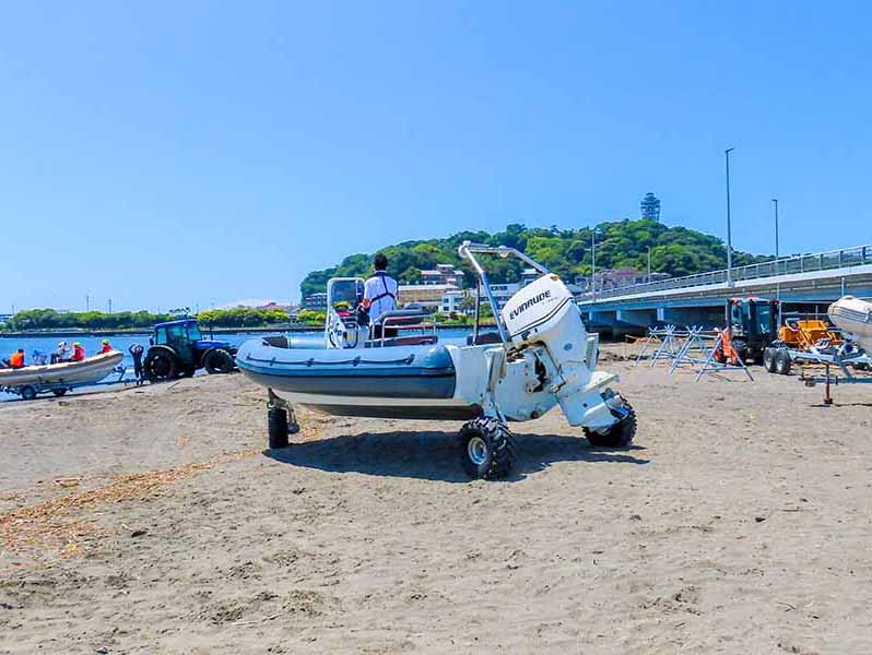 大きな3つのタイヤで砂浜を走ることができ、 海上では風をきるように高速で走ることができる高性能なボートです。 湘南の爽やかな潮風を感じながら、 スリリングな海上散歩を満喫できる最高の体験が待っています。